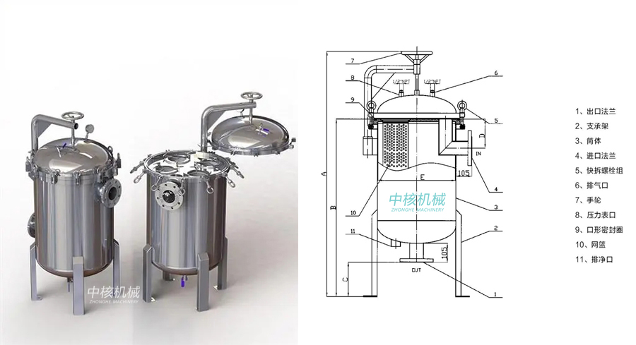 袋式過濾器是一種結構新穎、體積小、操作簡便靈活、節能、密閉工作的多用途過濾設備。袋式過濾器是一種壓力式過濾裝置,主要由過濾筒體、過濾筒蓋、快開機構、不銹鋼濾籃等部件組成。過濾機內部由金屬網籃支撐濾袋,液體由過濾器外殼的旁側入口流進濾袋,經濾袋過濾后從出口流出,雜質被攔截在濾袋中。該機更換濾袋十分方便,過濾基本無物料消耗。
